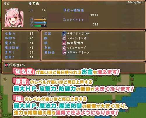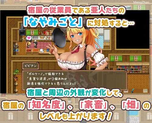 宿屋的店主卢克与亚人们共同经营着这家旅店。可以像角色一样培养旅馆,使其成长。提升旅馆的等级,每日收入和提升状态的范围也会随之扩大。倾听宿屋员工们,那些亚人奴○的烦恼,让我们一起将它培育成一家卓越的宿屋吧!在宿屋部分,通过与亚人交谈可以阅读剧情!好感度越高,而且地牢通关越多,可阅读的剧本不断增加!将全员的好感度提升至上限,并且还能打倒魔王……!