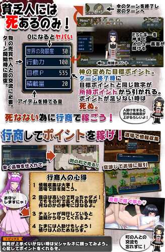 关键规则只有一个:『持有点数少的人会死亡』。主人公爱丽丝为了赚取生存所需的点数,决定成为一名商人。有时被强行发生性关系,或者卖淫……也许会和女孩们建立亲密关系,并进行百合性行为......也可能与人们交流,探索世界的秘密。爱丽丝充满性冒险的危险商人生活开始了!主要角色包括:- 爱丽丝 cv: 杏子御津 “我因交通事故死亡,在这个世界转生了。”