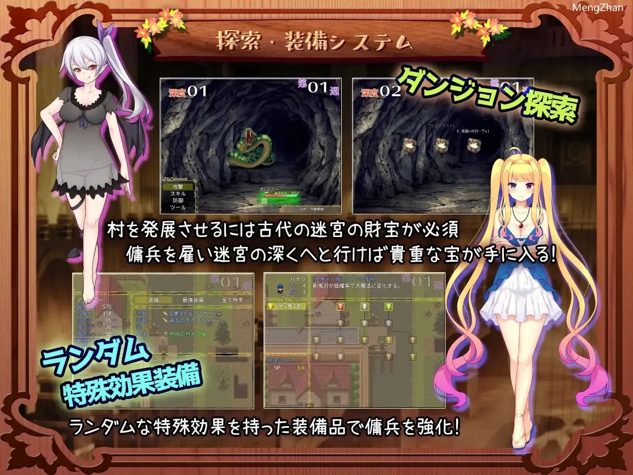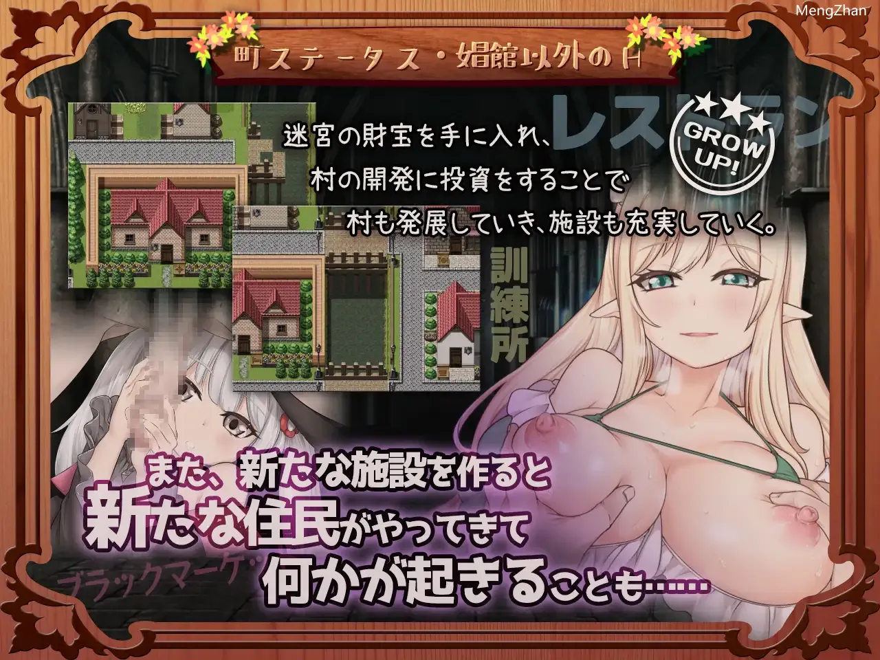 ハクスラ×娼館×村発展RPG为了重建寂静的村庄,村长的姐妹和童年玩伴们挺身而出!为了扩大村庄规模,村长们想要获取地下迷宫中的宝藏,于是提出一个计划。那就是开设娼館吸引人气到村庄,用娼館收入雇佣强力雇佣兵,攻略迷宫并寻找宝藏的计划。目标是成为国家中最兴旺的村庄,还有最顶级的娼館!进行战斗和获取装备不断强化你的队伍!据说地下迷宫中的宝藏对于扩大村庄至关重要。为了到达拥有宝藏的迷宫深处,操作雇佣兵并攻略迷宫吧。迷宫攻略以非场景型展开,反复与怪物战斗。赢得则得到装备,失败则雇佣兵们会立即撤退。怪物很强大,但通过反复攻打迷宫并提升装备,你将可以前往更深处。- 击败怪物