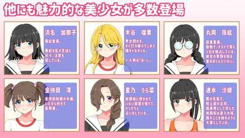 一款以学园为舞台的RPG游戏。主人公是一个平凡无奇的男生,某日突然获得了能够通过文字改变他人意识的能力。他将如何运用这种力量,在校花校草云集的学校中赢得美少女们的青睐?本作主打后宫要素,共有10名可攻略角色,她们性格迥异、各有特色。除了4位主要女角以外,还有6位次要女角供玩家收集。游戏系统相对简单,但事件量和CG数量都十分丰富。阴毛有无及浓密程度均可自由设置。推荐给喜欢学园后宫RPG的绅士们体验。