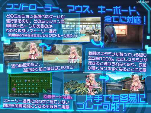 ・战斗和性爱场景中的反应会根据主角的状况而有所不同,例如敏感部位、处女、淫秽痕迹等。