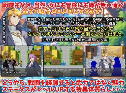 游戏内容:战斗也不行。魔法和智力都没有的我。当然,女性与冒险也无缘。…某天,在小镇上偶遇了一只迷失的小型迷路怪物。慌忙投出的石头偶然击中,总算首次成功击败了怪物。于是,在镇上擦肩而过的女子回头看了我两眼!似乎一旦经历战斗,不是通过武力,而是通过魅力状态提升的特殊体质……。